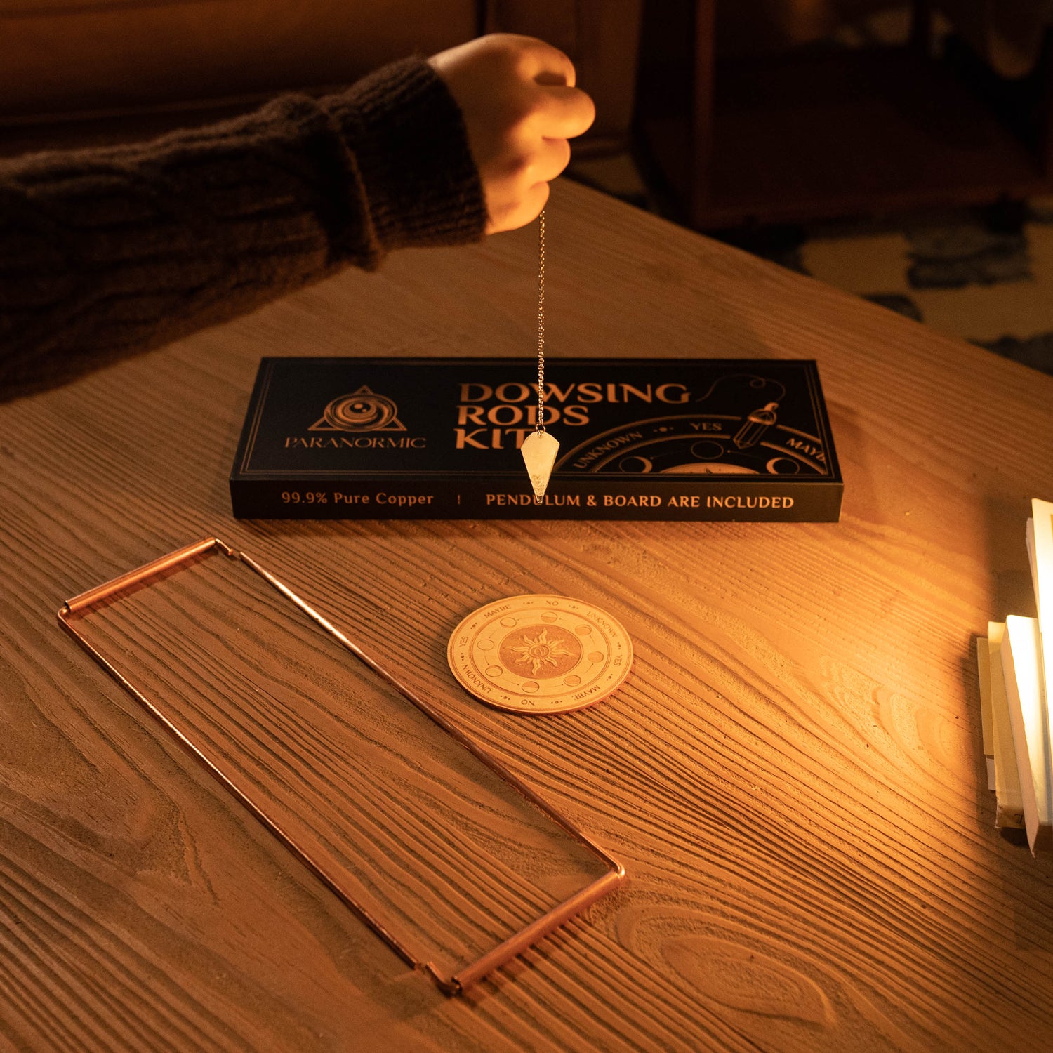 Our Paranormic Spirit Board reimagines the timeless game of spirits, bringing whispered messages from the beyond to your fingertips. We've also introduced the Dowsing Rods Kit, a comprehensive set complete with copper spirit sticks and a pendulum for divination, designed to help you channel both spiritual energy and innate intuition.