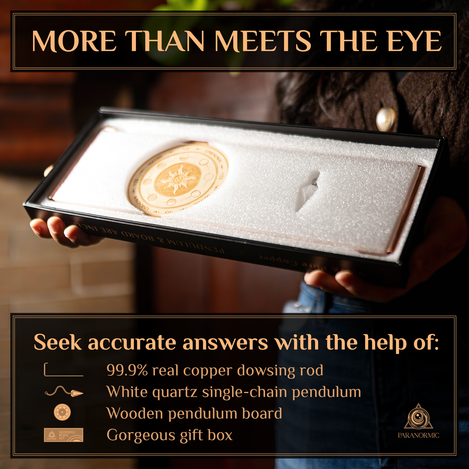- Seek the Intangible – Your kit includes a crystal pendulum, 2 dowsing sticks, and a glorious wooden message pendulum mat. Use Paranormic ghost hunting tools to detect fresh water and metals, tackle spirit ghost hunting, and more.